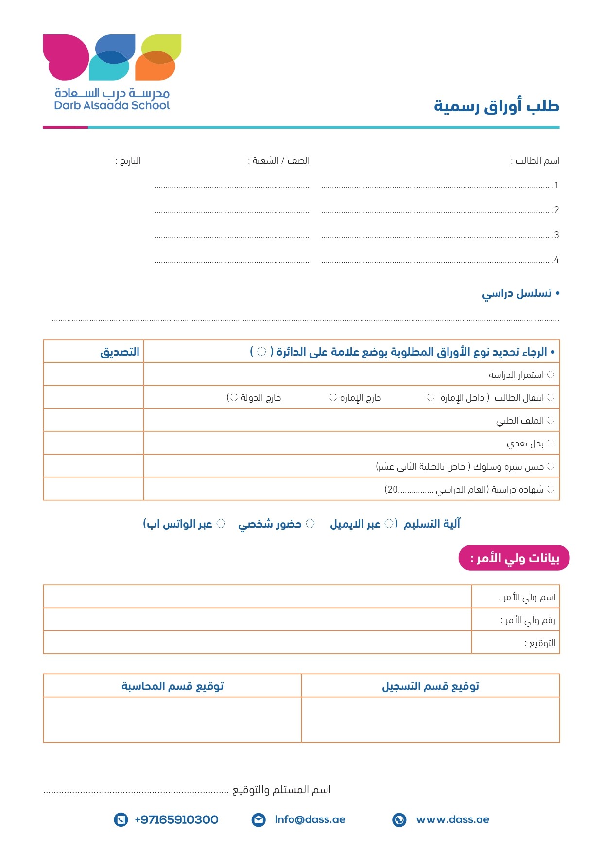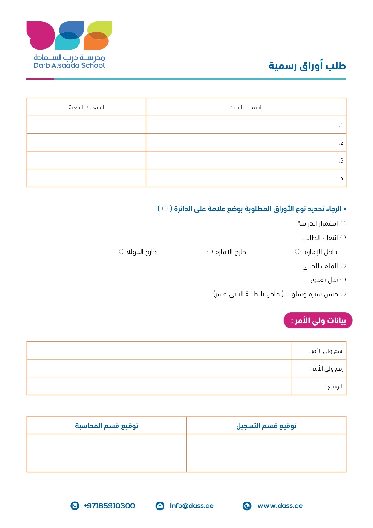ﻳﺘﻢ ﻣﺮاﺟﻌﺔ اﻟﻤﺪرﺳﺔ ﻣﻦ ﻗﺒﻞ وﻟﻲ اﻷﻣﺮ ﻻﺳﺘﻜﻤﺎل إﺟﺮاءات اﻟﺘﺴﺠﻴﻞ ﺑﺤﺪ أﻗﺼﻰ 3 أﻳﺎم ﻋﻤﻞ.